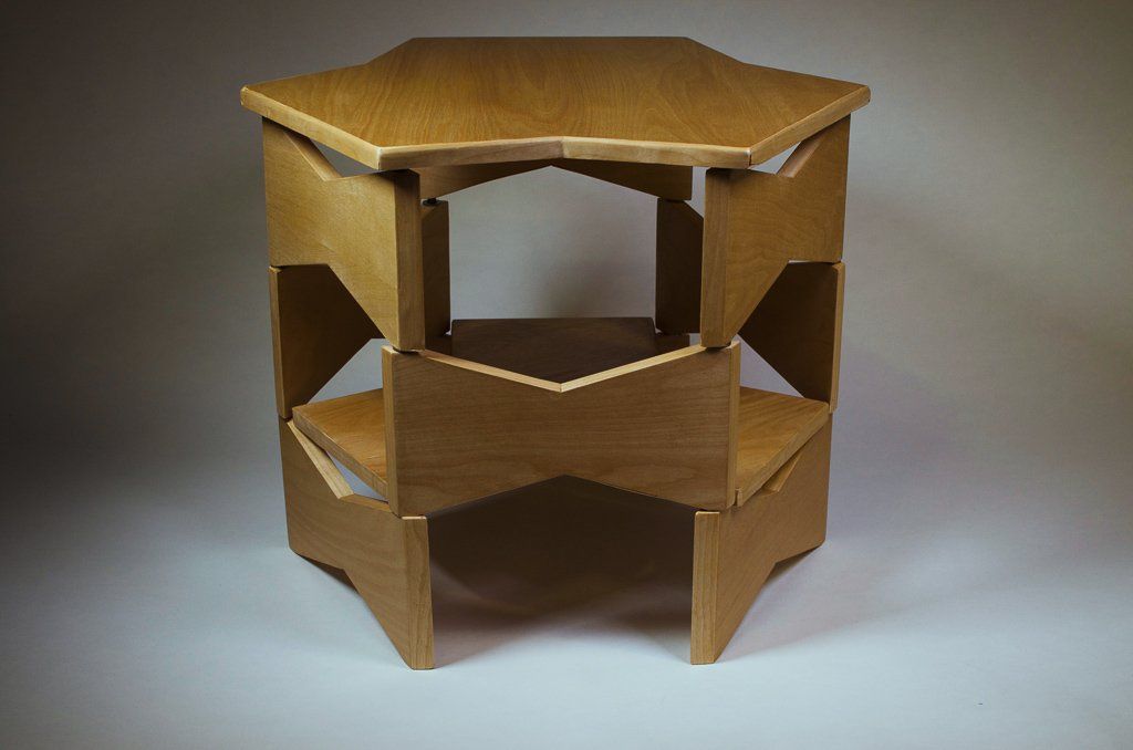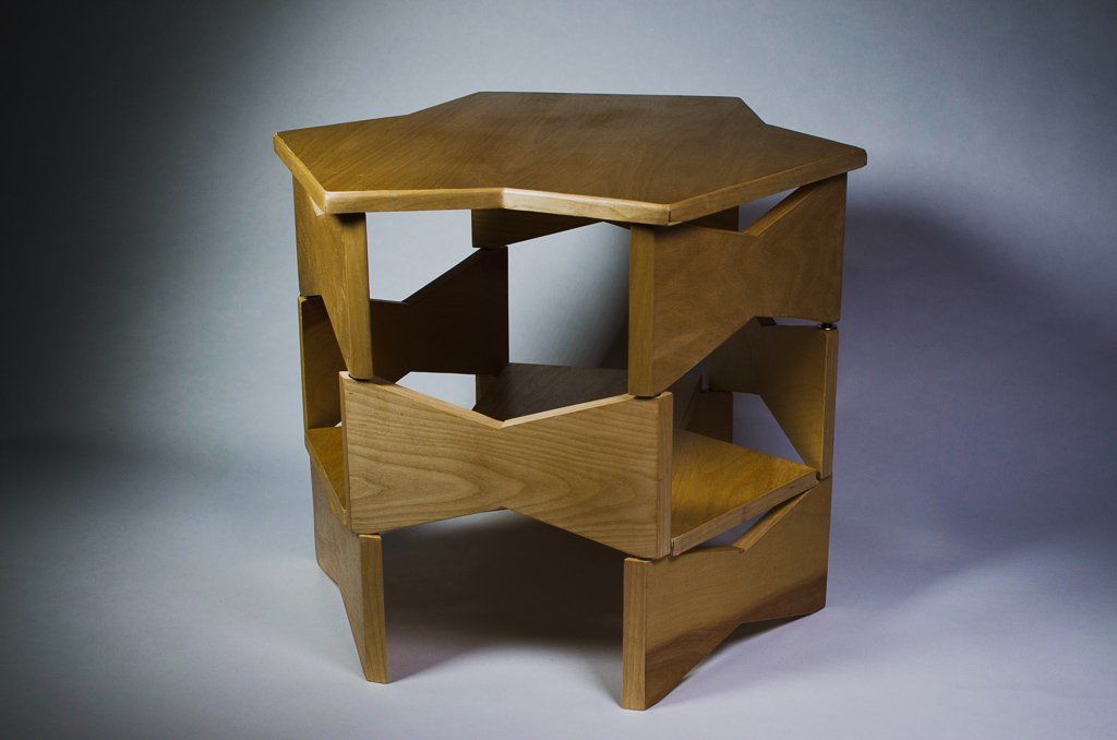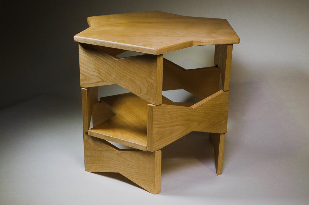 A shelf within the body of the stool offers storage for coats, bags, or any other items.