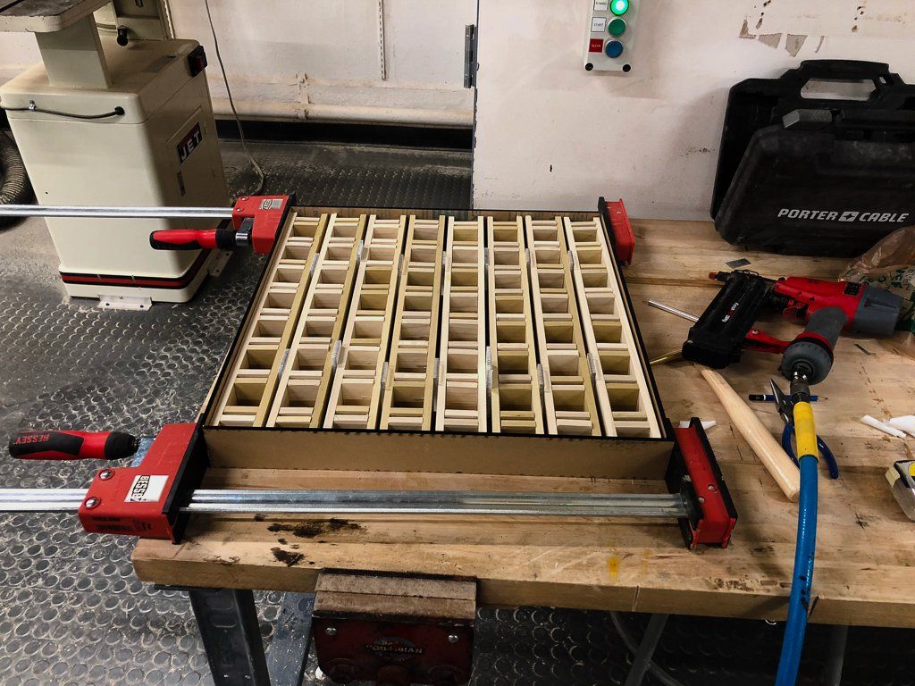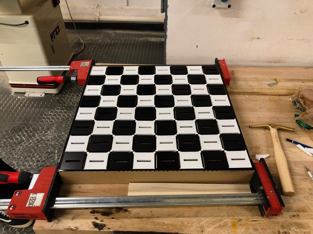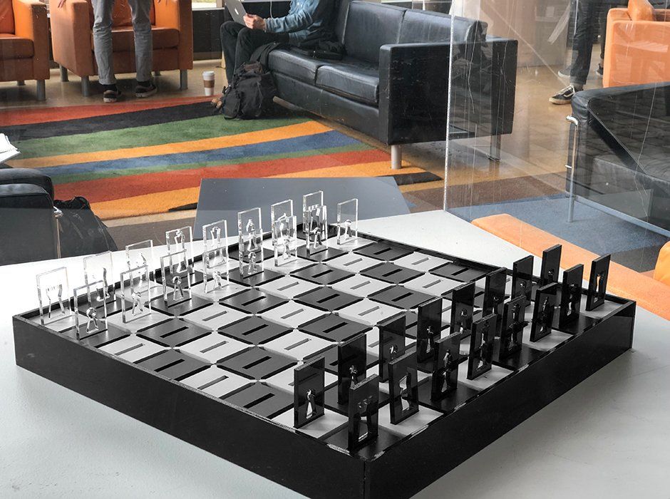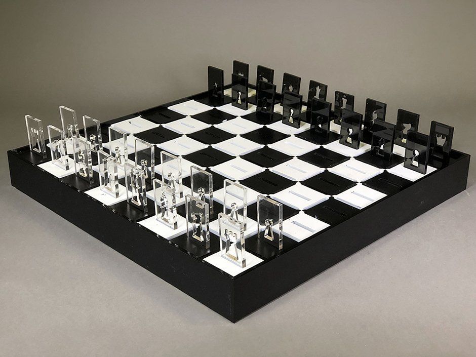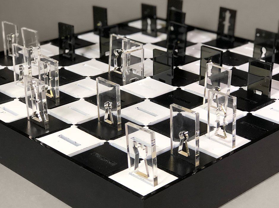 A new take on the classic game of chess, this set features pieces that fit into slots in the center of each square.