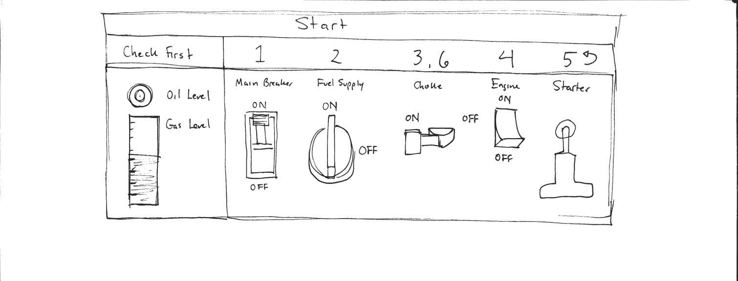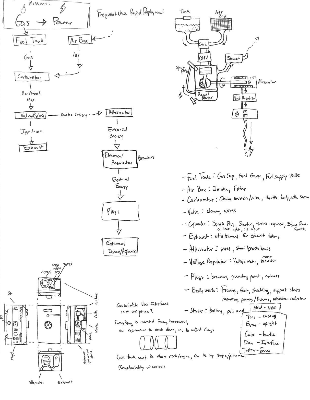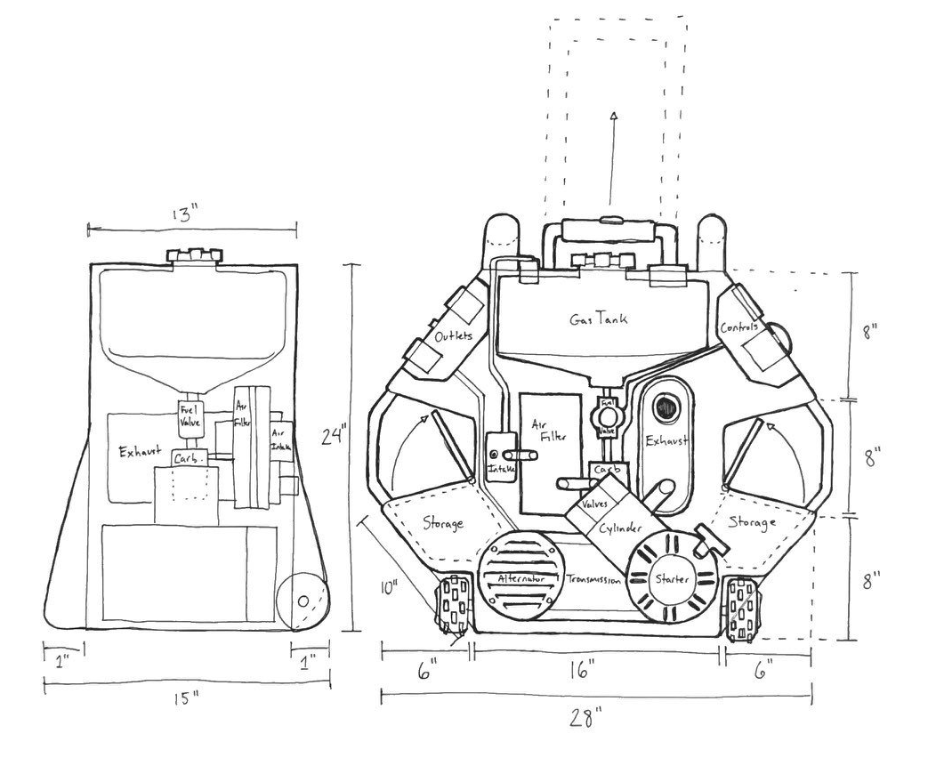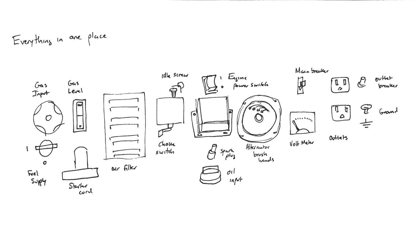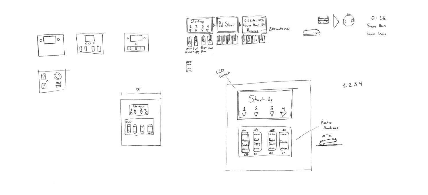 Our group went through the initial phase of brainstorming, iterative exploratory sketching and decision making on how the components would be arranged, what features, controls, and feedback the generator would provide, what materials would be used, and what the manufacturing would entail.