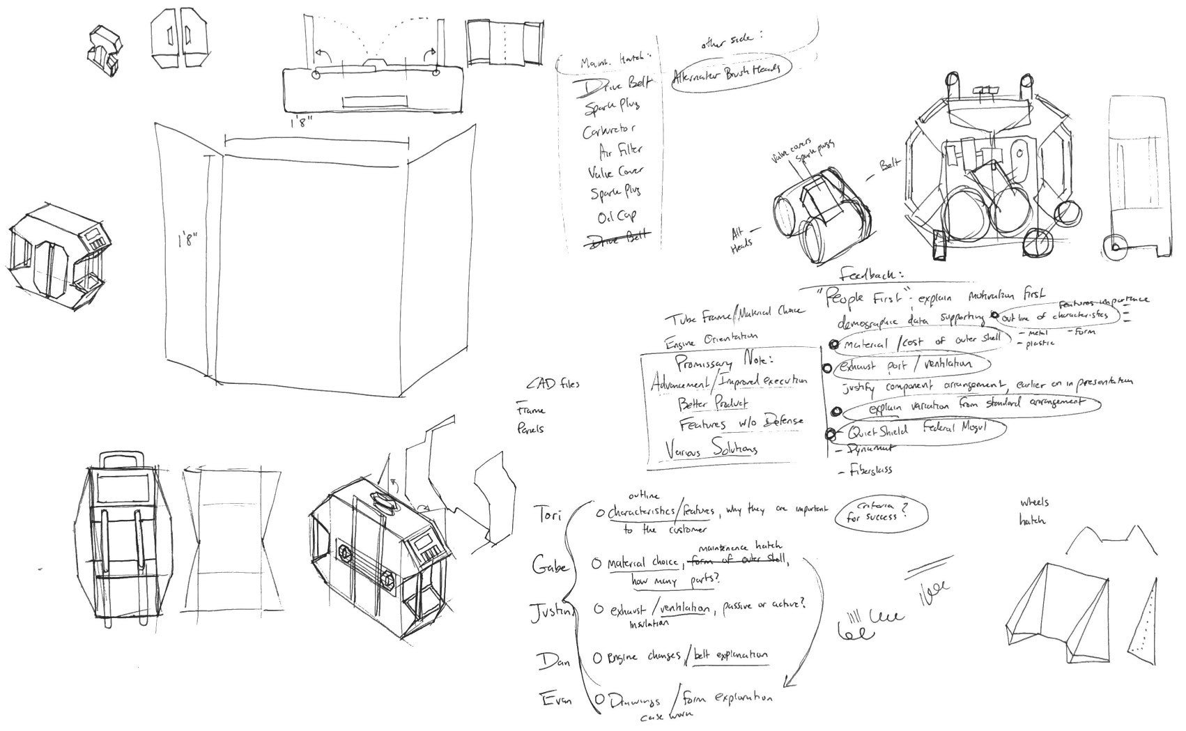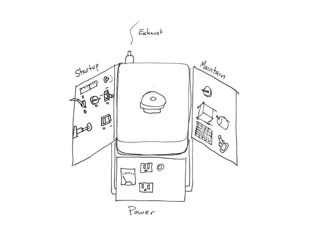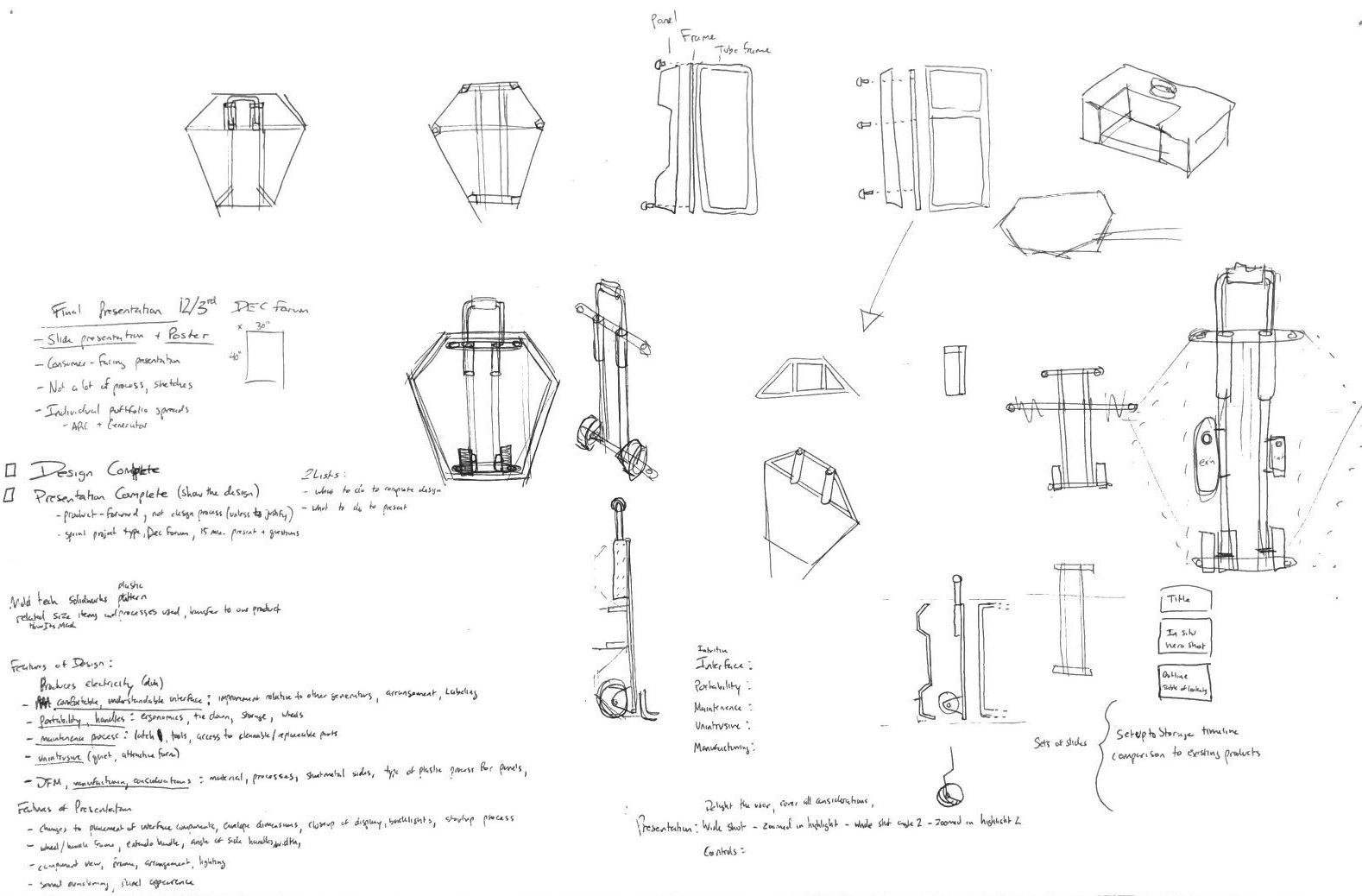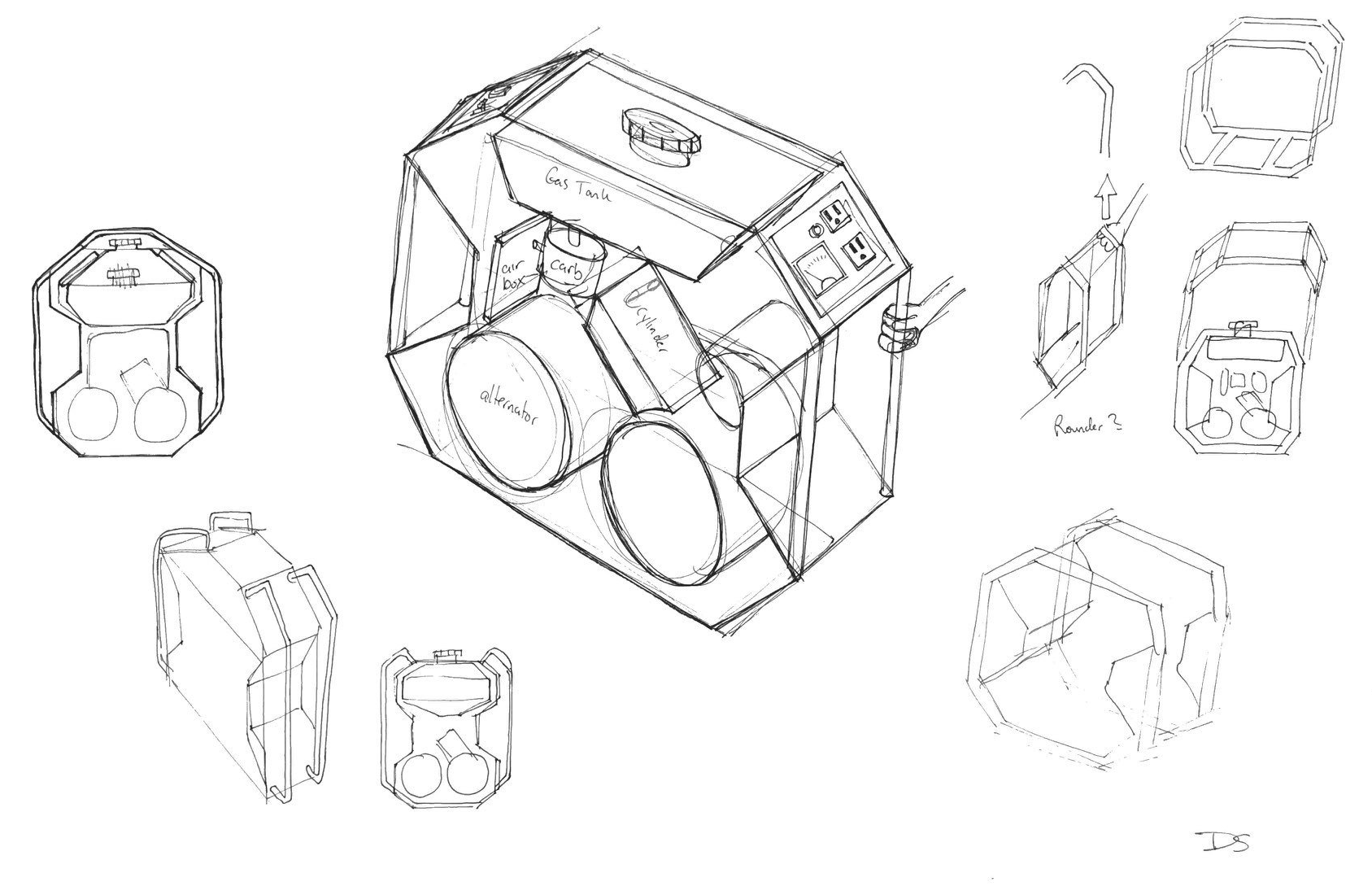 Our group went through the initial phase of brainstorming, iterative exploratory sketching and decision making on how the components would be arranged, what features, controls, and feedback the generator would provide, what materials would be used, and what the manufacturing would entail.